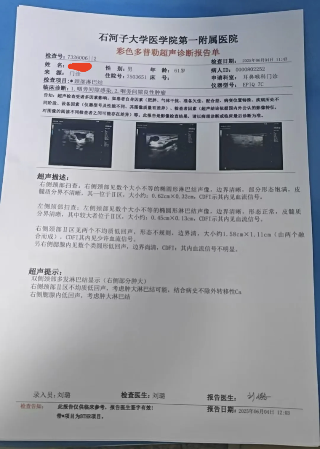 📅 2025年6月1日与6月4日:颈部淋巴结超声检查